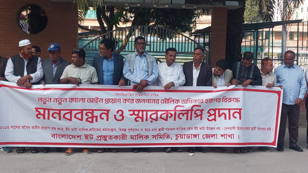 কঠোর আইন বাতিলের দাবিতে চুয়াডাঙ্গায় ইট প্রস্তুতকারী মালিক সমিতির মানববন্ধন ও স্মারকলিপি প্রদান।