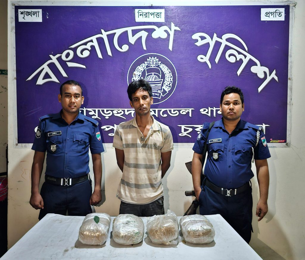 চুয়াডাঙ্গা জেলার পুলিশ সুপার জনাব আর এম ফয়জুর রহমান, পিপিএম-সেবা, মহোদয়ের দিকনির্দেশনায় জেলা পুলিশের সকল ইউনিটে একযোগে মাদক বিরোধী অভিযান পরিচালিত হচ্ছে। তারই ধারাবাহিকতায় দামুড়হুদা মডেল থানা কর্তৃক মাদক বিরোধী অভিযানে জনাব মোঃ আলমগীর কবীর, অফিসার ইনচার্জ, দামুড়হুদা মডেল থানা, চুয়াডাঙ্গার নেতৃত্বে এসআই(নিঃ)/মোঃ ইউসুফ আলী ও এএসআই(নিঃ)/মোঃ মিজানুর রহমান, দামুড়হুদা মডেল থানা, চুয়াডাঙ্গা সঙ্গীয় ফোর্সসহ মাদক বিরোধী অভিযানে ১০ জুন ২০২৪ খ্রিঃ রাত ২৩:১০ ঘটিকায় দামুড়হুদা থানাধীন ডুগডুগি বাজারস্থ জনৈক মোঃ মুছা (২৮), পিতা- মৃত ময়না এর চায়ের দোকানের সামনে পাঁকা রাস্তার উপর থেকে আসামী ১। মোঃ রাসেল (২৮), পিতা- মোঃ রবিউল ইসলাম, মাতা- রিতা বেগম, সাং- দক্ষিন চাঁদপুর, থানা- দর্শনা, জেলা- চুয়াডাঙ্গা’কে ০৪ (চার) কেজি অবৈধ মাদকদ্রব্য গাঁজা সহ হাতেনাতে আটক করে।গ্রেফতারকৃত আসামীর বিরুদ্ধে দামুড়হুদা মডেল থানায় মাদকদ্রব্য নিয়ন্ত্রণ আইনে নিয়মিত মামলা রুজু করা হয়।