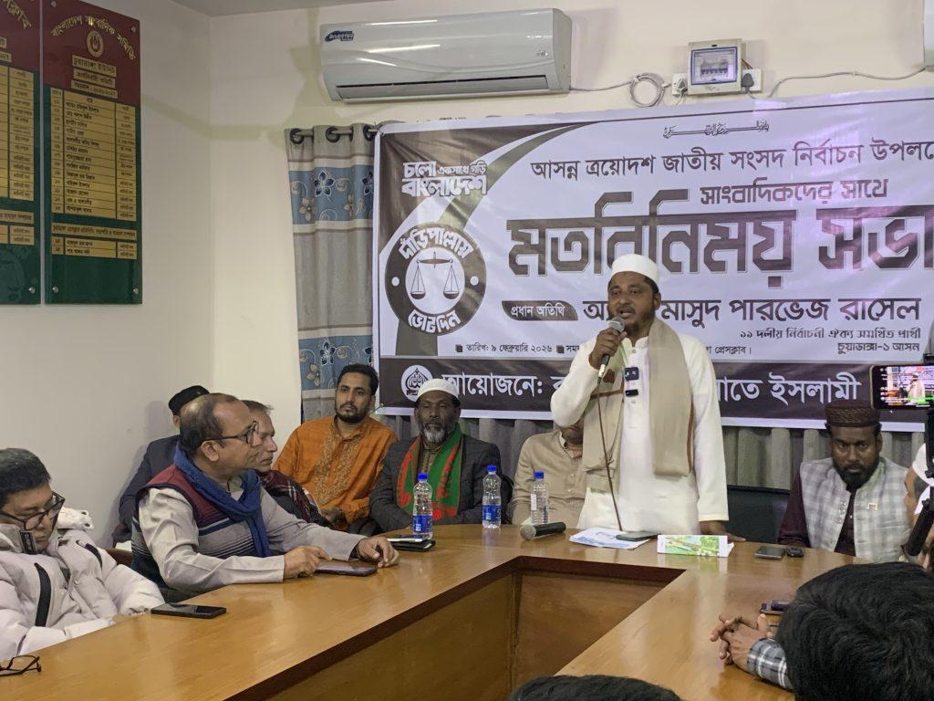 চুয়াডাঙ্গা-১ আসনে বাংলাদেশ জামায়াতে ইসলামীর মনোনীত প্রার্থী অ্যাডভোকেট মাসুদ পারভেজ রাসেল – জেলার প্রিন্ট ও ইলেকট্রনিক্স মিডিয়ার সাংবাদিকদের মতবিনিময় করেছেন।