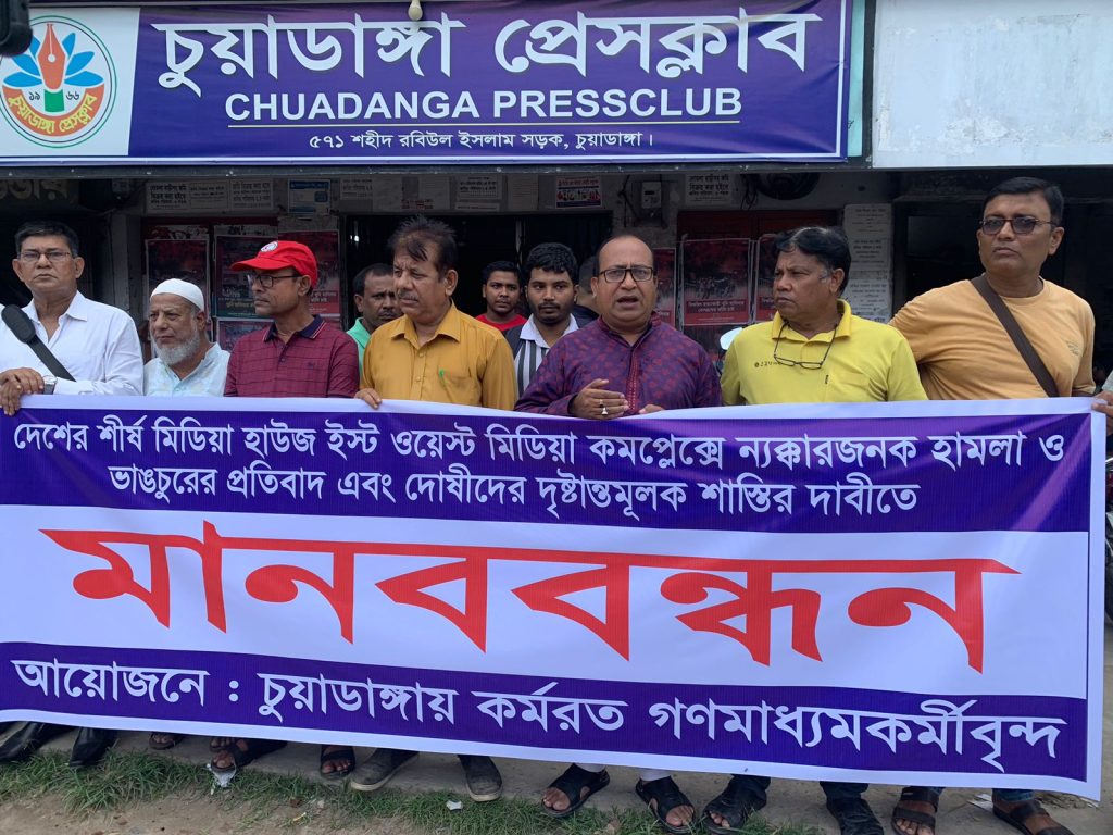 সারাদেশের বিভিন্ন মিডিয়া ও সংবাদকর্মী এবং শীর্ষ মিডিয়া হাউস ইস্ট ওয়েস্ট মিডিয়া কমপ্লেক্সে ন্যক্কারজনক হামলা ও ভাঙচুরের প্রতিবাদ এবং দোষীদের দৃষ্টান্তমূলক শাস্তির দাবীতে মানববন্ধন করেছে চুয়াডাঙ্গায় কর্মরত গণমাধ্যমকর্মীরা। মঙ্গলবার বেলা সাড়ে ১২টায় চুয়াডাঙ্গা প্রেসক্লাবের সামনে এ মানববন্ধন অনুষ্ঠিত হয়।