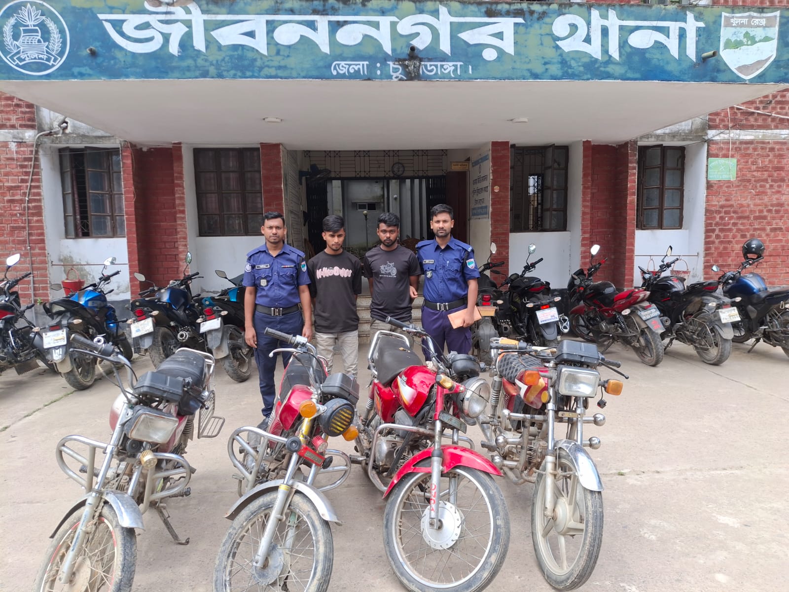 চুয়াডাঙ্গার জীবননগর থানা পুলিশের অভিযানে আন্তঃজেলা চোরচক্রের দু’জনকে গ্রেফতার করেছে এবং তাদের নিকট থেকে ৪টি মোটরসাইকেল উদ্ধার করেছে।